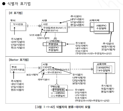 | 대표성 여부 | 생성여부 | 속성수 | 대체여부 | | — | — | — | — | | 주식별자 | 내부식별자 | 단일식별자 | 본질식별자 | | 보조식별자 | 외부식별자 | 복합식별자 | 인조식별자 |